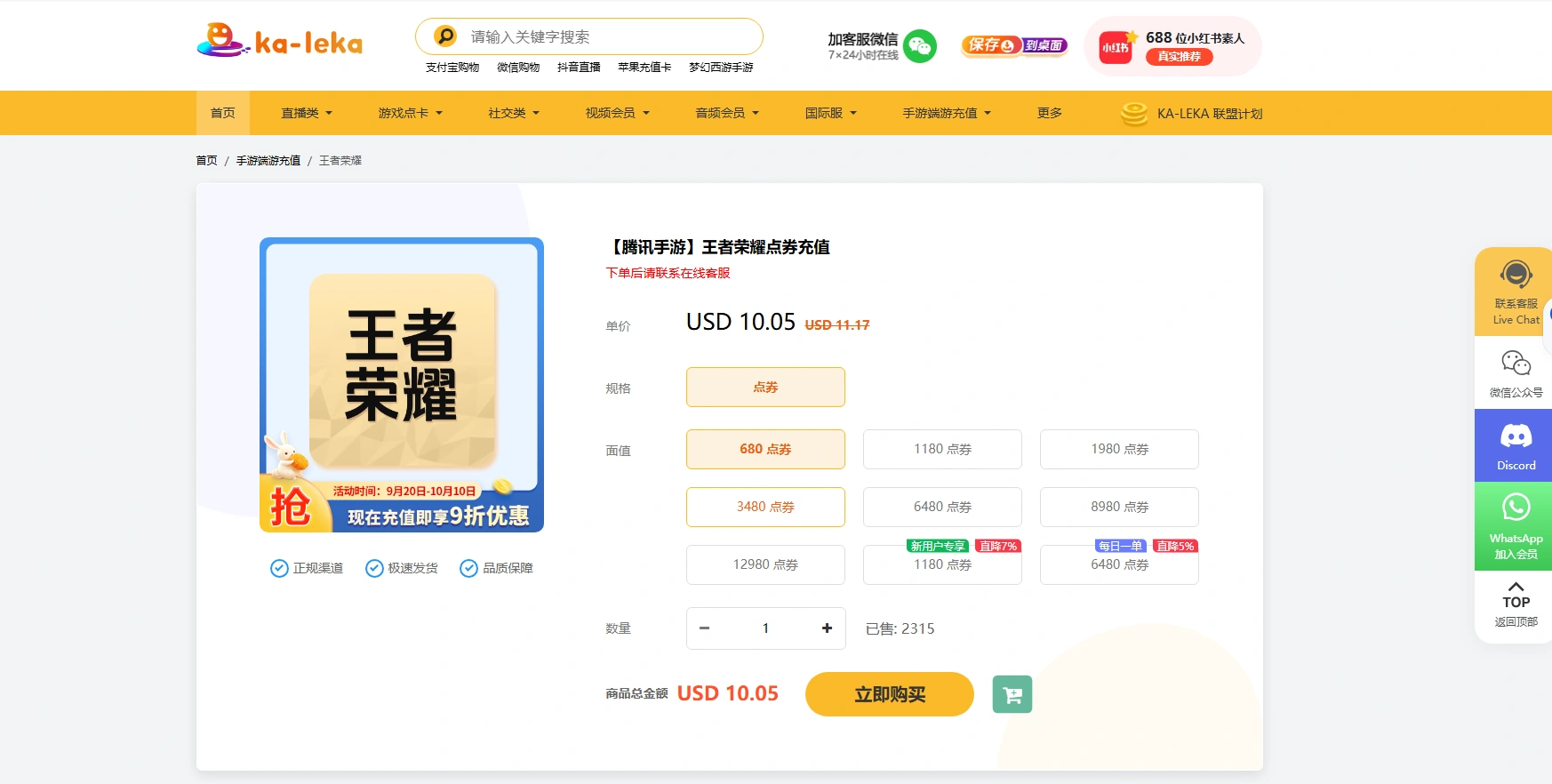 海外用户建议通过ka-leka卡乐卡完成点券充值,操作便捷、到账迅速,轻松享受《王者荣耀》最新版本内容。