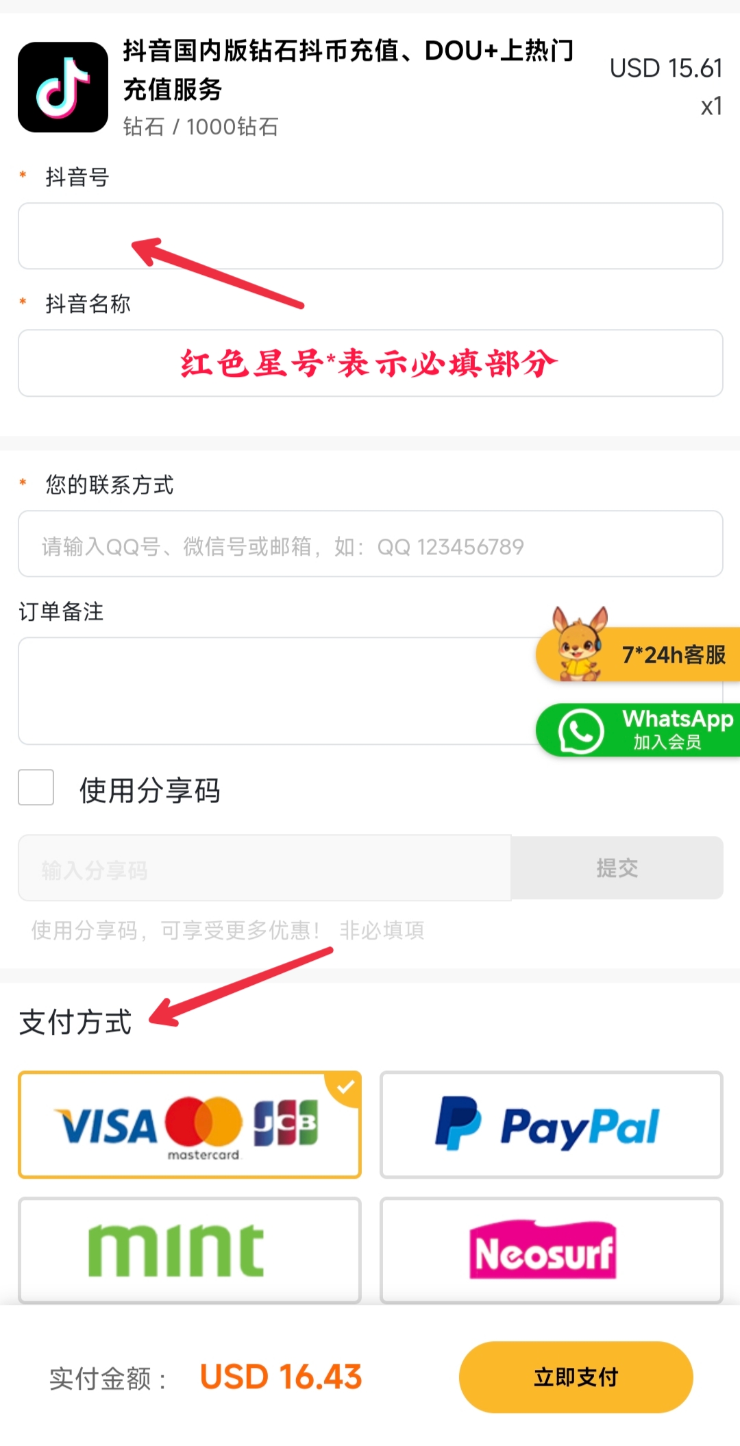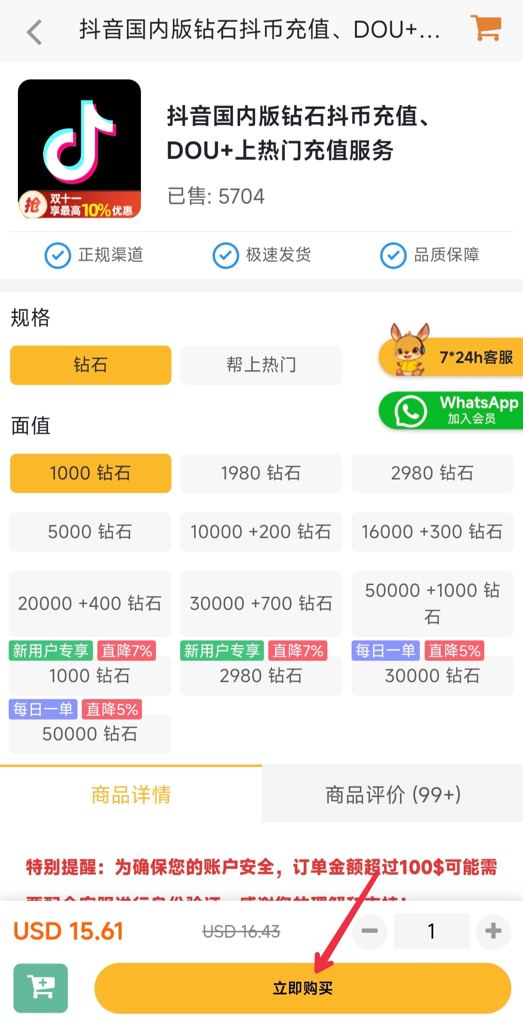 第二步:选择钻石面值,叠加多重优惠,确认以进入订单页