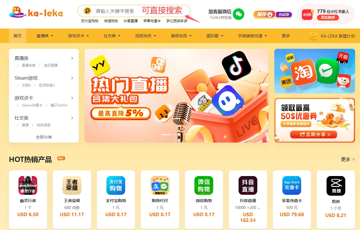 1、第一步:进入卡乐卡首页选择需要充值的产品,搜索栏也可直接输入查找。首页顶部可自由切换语言和货币。