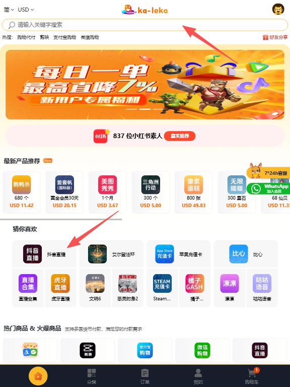 打开卡乐卡ka-leka官网,在首页搜索框输入“抖音国内版钻石”,也可通过首页推荐栏的图标直接进入抖音充值专区。