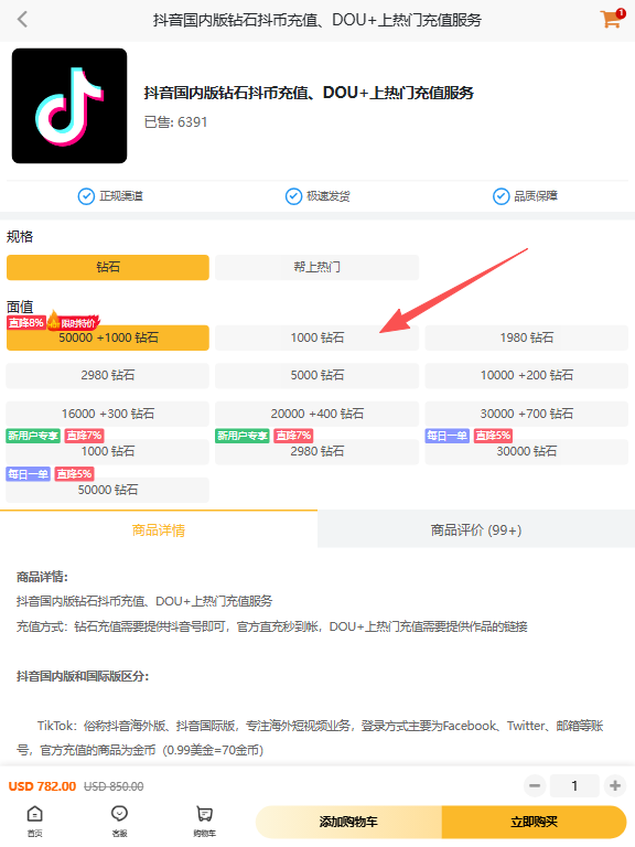进入商品页后,先确定充值类型(如“钻石充值”或“帮上热门”),再根据需求选择钻石面值(如1000钻石、5000钻石等)。注意:新用户专享、每日一单等优惠选项可同步勾选,享受更划算的价格。