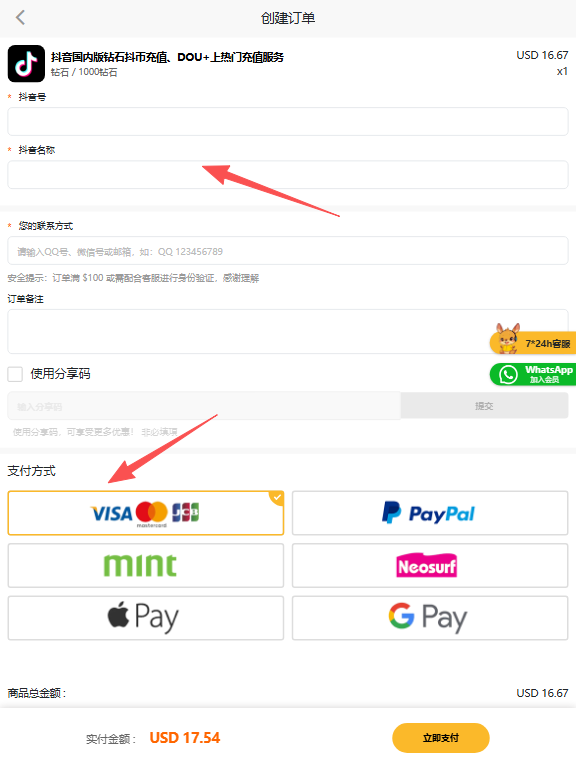 • 抖音名称:辅助验证账号信息(必填,提升充值准确性);
