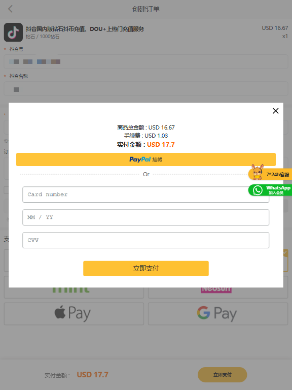 在支付方式区域,可选择VISA、PayPal等方式。以PayPal为例,点击后会弹出支付窗口,输入银行卡或PayPal账户信息完成付款。支付成功后,订单金额(含手续费)会清晰展示,确认无误后点击“立即支付”即可。
